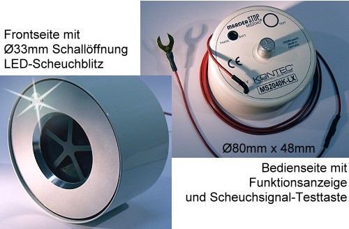 Eine ausgeklügelte Schaltungstechnik zur Erzeugung der über 6000 Warnfrequenzen des marderSTOP MS2040® sorgt für sicheren, stetigen Betrieb auch bei größeren Temperaturschwankungen oder sogar bei sinkender Bordspannung. Die Strom-Aufnahme ist ab 0,16 mA unerreicht niedrig in der Scheuchpause und belastet Ihren Akku in der meisten Zeit somit kaum; daher kann das Gerät ständig in Betrieb bleiben. Die Stromversorgung erfolgt per Montage über das Chassis (Minus) und über einen einfachen Zuleitungsdraht (Akku, Plus) mit bereits integrierter Sicherung; der Einbau ist somit einfach und kann minutenschnell durchgeführt werden. Das Gerät ist zudem verpolungssicher, spritzwassergeschützt und funkentstört. Durch Stromentnahme ausgelöste Alarmanlagen oder Ultraschall-Abstands­melder werden nicht beeinflußt. marderSTOP MS2040® ist in allen Versionen auf optimale Schall-Leistung gezüchtet und benötigt keine Zusatz-Schallgeber. Bei den erweiterten Ausführungen können Sie zusätzlich über eine Anzeige die Scheuchphasen beobachten oder den Warnton mittels Test-Taste in den hörbaren Bereich versetzen oder sich sogar den Ladezustand Ihres Akkus anzeigen lassen. Optional ist eine Fernkontrolle/Fernbedienung des Gerätes vom Armaturenbrett aus möglich und es ist sogar u.a. als kombinierte Alarmsirene (Überfallmelder!) erhältlich! Die Anzeige der Scheuchphase ist so hell, daß deren Lichtblitze über rückseitige Licht-Reflexionen bereits auch optisch abschrecken! Neuartig — und allein von KONTEC angeboten — ist die im Bereich oder Zentrum des Schallgebers eingebaute superhelle, blitzweiß strahlende Leuchtdiode neuester Technologie, die durch ihr Aufflackern im frontalen Bereich die Scheuchwirkung auf ein Maximum treibt! Nach Einbau des Gerätes bleibt der Motorraum für Wartungsarbeiten frei zugänglich. marderSTOP MS2040® arbeitet mit der ungefährlichen Ultraschall-Methode und gibt keine Hochspannung frei.